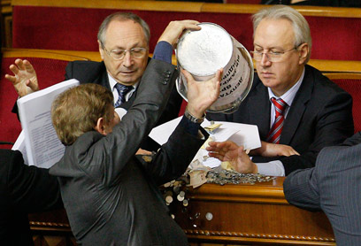 בית המחוקקים האוקראיני נדרש אתמול (ה') לאשר בקריאה שנייה את התיקון לחוק, אולם ויכוחים סוערים פרצו בין חברי מפלגת "מולדת" של ראש הממשלה לשעבר, יוליה טימושנקו, לפוליטיקאים ממפלגת "מחוזות" היריבה, שמנהיג ראש הממשלה המכהן, ויקטור ינוקוביץ'. אנשי "מולדת", שמתנגדים לרפורמה, אף שפכו דליים מלאים במטבעות במחאה על בזבוז הכספים.