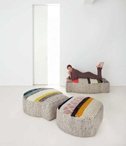 סדרה של פופים עשויים משטיחי מנגה שנראים כאילו עוצבו משאריות של סוודרים שנסגרו בעבודת יד.