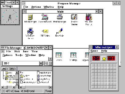 ככה נראה ווינדוס 3.1. היה לו יישום תמוה בשם "מנהל הקבצים", ששימש לפעולות מסובכות כמו העתקת קבצים; הייתה לו תמיכה ב-32 ביט ולא רק ב-16 - וגם משחק הרוורסי התחלף במשחק שהפך את פקידות העולם לזומבים: שולה המוקשים.