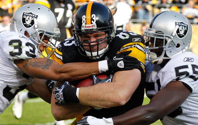 הית' מילר מהסטילרס פורץ בקלות את הגנת הריידרס (AP)