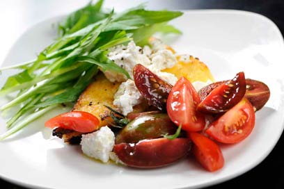 פולנטה צלויה עם סלט זני עגבניות שרי, ריקוטה ועלי מיזונה