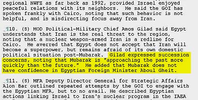 הדברים נאמרו, על-פי אחד המסמכים, בדצמבר 2009 במהלך דיון משותף עם תת שרת ההגנה האמריקנית, אלן טאוצ'ר, שעסק בהתעקשות המצרים על הקמת אזור חופשי מנשק גרעיני במזרח התיכון, במטרה להסיט את מוקד תשומת הלב הבינלאומית מאיראן לישראל.