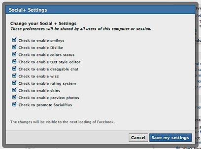 SocialPlus הוא שם התוסף, שמיועד בלעדית לפייסבוק (דהיינו, הוא לא משנה שום דבר בדפדפן עצמו, ואפילו לא מוסיף אייקון סמוך לשורת הכתובות – אלא פועל בתוך הרשת החברתית בלבד).