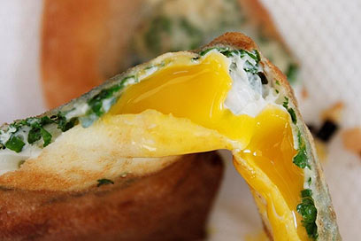 - מחלקים אותו בדמיון לחצי. על חצי אחד בלבד מפזרים בצל, פטרוזיליה, מעט מלח גס ופלפל לפי הטעם. שוברים בעדינות את הביצה ומניחים על התבלינים. מקפלים מייד, שהבצק לא יירטב.