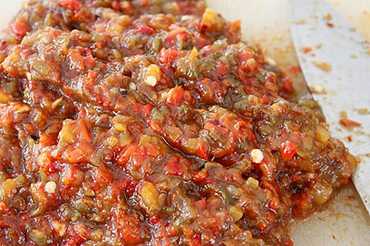 - לתערובת הפלפלים הקצוצים מוסיפים שום, מלח ושמן זית. מערבבים היטב, אוכלים עם בריקים חמים, שיצאו הרגע מהמחבת וחולמים על ירח דבש בתוניס.