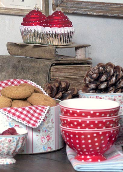 נקודות פולקה לבנות על רקע אדום, משבצות ודפוסים פרחוניים בהשראת הדפסי וינטג' עתיקים משתלבים יפה גם בכלי אוכל ומטבח