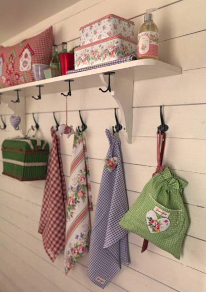שילוב של משבצות קטנות ופרחים על מגבות מטבח, קופסאות מתכת מעוטרות ופריטים דקורטיביים התלויים על קיר מחופה עץ במטבח