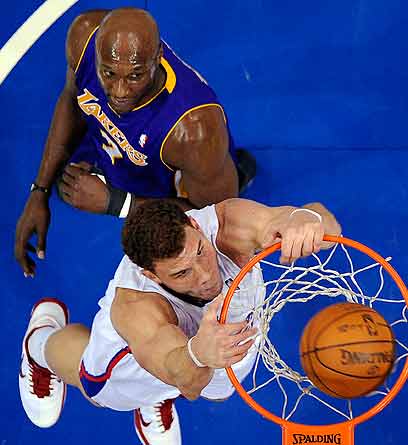 גריפין מטביע על אודום. לא הצליח לעצור את הלייקרס (צילום: AP)