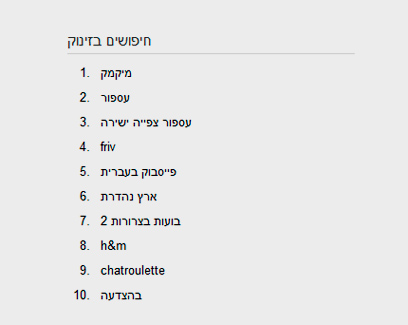 הגרף הבא מציג את 10 בקשות החיפוש שצברו תאוצה בקצב הגדול ביותר ב-2010 ביחס ל-2009. מגמות החיפוש השנה מעידות שהישראלים נתפסו חזק ברשתות החברתיות וגם תחום המשחקים פופולרי מאוד. במקום הראשון נמצא מיקמק, ולמי שלא מכיר נספר כי מדובר בעולם וירטואלי לילדים. תוצאות מוכרות יותר הן חיפושים לסדרת הדרמה “עספור”, פייסבוק, ארץ נהדרת, H&M וצ’ט רולט. Friv הוא אתר משחקים און ליין ובועות בצרורות 2 הוא גם משחק. התוצאות האלה מעידות יותר מכל על כוחו של הקהל הצעיר ברשת, אשר האתרים והנושאים שהוא מחפש שונים לחלוטין מתחומי העניין של הקהל הבוגר יותר. חשוב לזכור כי מגמות החיפוש האלה סוננו ונערכו על ידי גוגל ואינן כוללות פורנו או חיפושים אחרים, “הולמים” פחות.