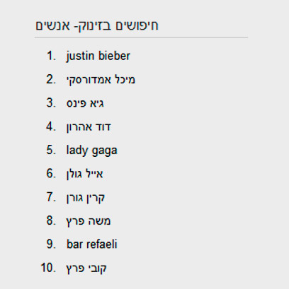 המגמות בחיפוש אנשים מצביעות אף הן על כוחו של הקהל הצעיר במחפשים. התוצאות הן שילוב בין זמרים וכוכבי בידור (גוגל טעו באיות שמו של דודו אהרון).