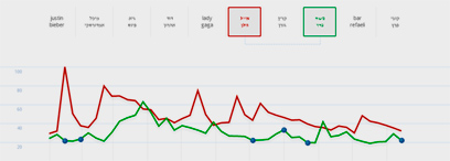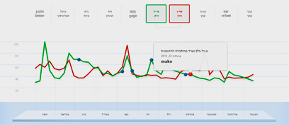 המצגת מאפשרת להשוות בין מגמות החיפוש של שני אנשים או יותר. למשל, השוואה מתבקשת בין אייל גולן לקרין גורן. מעניין לראות שהקפיצות בעניין אינן תמיד באות במקביל לפרסום של האתר בכלי תקשורת מובילים.
