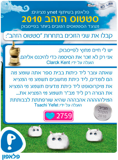 פלאפון בשיתוף ynet מציגים: הזוכים בתחרות סטטוס הזהב 2010 מצאתם טעות בכתבה? כתבו לנו תגיות: תוכן שיווקי פתיחת כל התגובות סגירת כל התגובות תגובה חדשה הצג: מהסוף להתחלה מההתחלה לסוף מומלצות הגולשים עוררו עניין אזהרה: פעולה זו תמחק את התגובה שהתחלת להקליד ביטול אישור לא נמצאו הודעות. פלאפון, סטטוס הזהב שני הזוכים בתארים "סטטוס הזהב" ו-"חביב הקהל" קיבלו במתנה אייפון 4 שתף בפייסבוק מומלצים