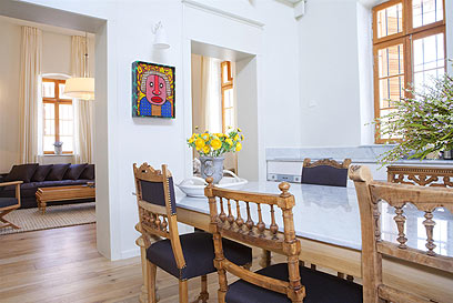 לצד הפריטים הישנים בחרו השניים לרהט את הסוויטות בריהוט מודרני רחב מידות ומפנק, בספות עמוקות ורכות במיוחד שכיף לשקוע בהם ולהתרווח עם ספר טוב או חברים לשיחה. בחדרי השינה הוצבו מיטות גדולות במיוחד שמוצעות במצעי כותנה משובחים במראה וינטג'. במטבחים המחוברים לסוויטות הם בחרו להציב מקררי SMEG בגוון שמנת או תכלת ביייבי, במראה רטרו פיפטיז. ולצייד את החדרים במכשור ובציוד יוקרתיים, אפילו מכונת כביסה ומייבש משוכללים חבויים מאחורי ארון שירות בעל דלתות לבנות הנעלמות בתוך הקיר. חדרי הרחצה שעוצבו בסגנון ספא אומנם קטני מידות, אך מושלמים מבחינת עיצוב ודקור. כדי להשלים את התמונה - יצירות אמנות מודרניות של אמנים מקומיים מוצגות בסוויטות ומתחלפות כל כמה חודשים.