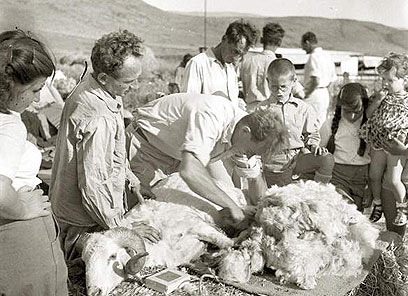 10. אברהם שניר גוזז מקצועי, בשעת גז הכבשה. לידו, חיים הורביץ