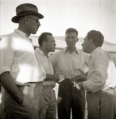 1. ויכוח סוער של חברי כפר סאלד עם משה שרת. משמאל דוד הכהן, גם הוא מהנהגת היישוב באותן שנים