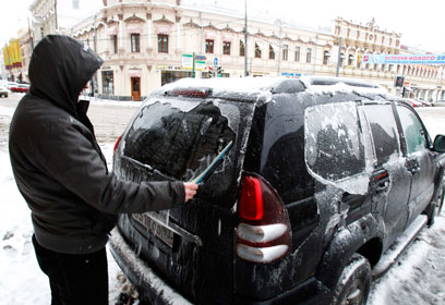 נהג מגרד שכבה עבה של קרח ממכוניתו (צילום: רויטרס)