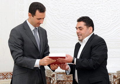 קונטאר מעניק לאסד את ספרו. היום בדמשק (צילום: AFP)