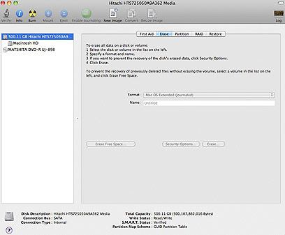 לאחר שדיסק ההתקנה עלה, המערכת תבקש מכם לבצע התקנה מחודשת - אל תבצעו אותה - אנחנו רוצים למחוק לחלוטין את המערכת ולהתחיל מאפס. בחלון התצוגה שלפניכם, גשו לתפריט ובחרו ב-Utilities. בחלון שנפתח בחרו ב-Disk Utility. לאחר הלחיצה תוכנת ה-Disk Utility תעלה, ובחלקו השמאלי של החלון תוכלו לראות את הכונן הקשיח שלכם - בחרו בו. בחלון המרכזי בחרו בלשונית ה-Erase. כל מה שנשאר לכם לעשות בעת הוא ללחוץ על הלחצן Erase בחלון החדש. חלון קטן יקפוץ ויבקש מכם לאשר את הבחירה שלכם - אשרו שוב.