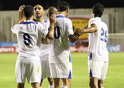 אסוס עם שחקני פתח תקווה. לא יעלה בהרכב הערב (צילום: אורן אהרוני)