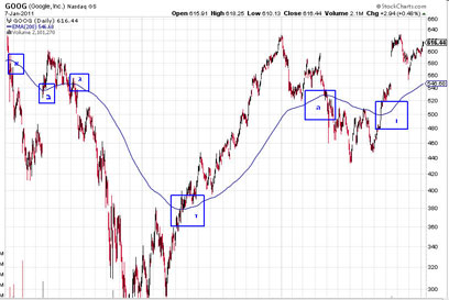 הגרף שנתון לפנינו הוא תנועת המניה (גוגל) במשך שלוש השנים האחרונות. בנקודה א' אנחנו רואים את תחילת הדרך: המניה ירדה מתחת לקו 200 ימים האחרונים. זה אומר שהמניה נתנה לנו סימן שהיא נכנסת למגמה יורדת, דובית.