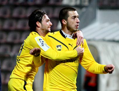 מדוניאנין ואבידור חוגגים את השער של הבוסני (צילום: אלי אלגרט)