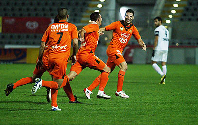 שלומי לוי והחברים בכתום חוגגים את השער הראשון (יועד כהן)