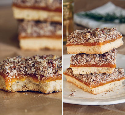 במסגרת ניסיון למצוא תוספת מתוקה הולמת לעוגת הפירות היבשים המסורתית של ט"ו בשבט, שאמא שלי נוהגת להכין בכל שנה, נתקלתי במתכון הבא בספר המצוין של מאפיית Baked הניו-יורקית. מדובר במעין חיתוכיות, אבל לא הקלאסיות שאנחנו מכירים. את הריבה המסורתית מחליפה מלית כתומה של משמש מיובש אותה מכינים בקלות על גבי להבה, ובבסיס הפריך של החיתוכיות, מסתתרת הפתעה של שבבי רוזמרין. השילוב של הרוזמרין עם מלית המשמש הוא שילוב מעולה, עדין ולא מתוק מדי, שמשאיר בפה טעם של עוד. התוספת האגוזית הנבזקת מעל כל אלה, הופכת את החיתוכיות הללו ללא ספק למאפה ראוי ביותר לכבוד ט"ו בשבט, ובמשך השנה כולה.