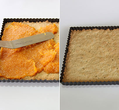 מצננים מעט, ומעבירים למעבד מזון. טוחנים למחית חלקה. את המחית שהתקבלה מורחים בשכבה אחידה על גבי הבצק האפוי.
