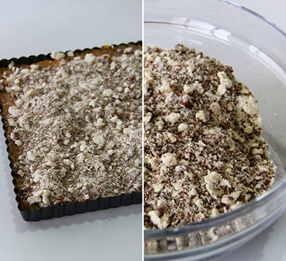 - ציפוי הפירורים: במיקסר עם וו גיטרה מערבלים יחד את הקמח, הסוכר, אגוזי הפקאן והמלח. מוסיפים את קוביות החמאה ומערבלים שוב עד לקבלת תערובת פירורית.