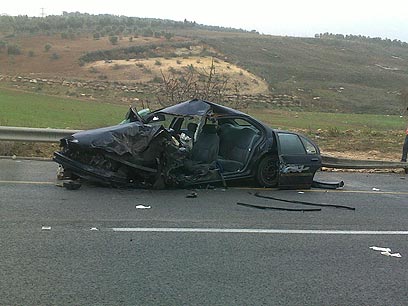 שברי המכונית. קורבן נוסף ב"כביש המוות" בצפון (צילום: אתר פאנט)