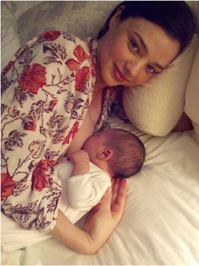 הדוגמנית פרסמה תמונה ביתית שצולמה על ידי הבעל אורלנדו בלום, שבה היא נראית מיניקה את הבן הטרי, וסיפרה שלא השתמשה במשככי כאבים, אבל אורלנדו תמך בה. אז היה שווה