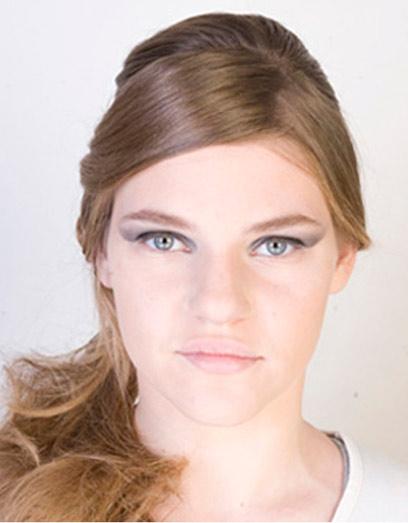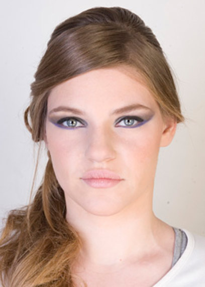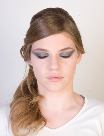 3. בחרי לעצמך צללית מטאלית כהה. בחרי צללית ברמת כהות בינונית עד גבוהה (יותר מרשים), למשל: ירוקה אפרפרה כמו בתמונה, ומרחי מהקצה הפנימי של העין ועד לעצם הגבה, ומשחי כלפי חוץ לכיוון הרקה. מלאי את כל שטח העפעף וחזקי אותו עם פיגמנט הצללית. טשטשי את גבולות הצללית מלמטה כלפי מעלה וכן גם בעצם הגבה.