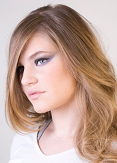 5. הוסיפי צללית סגולה. קחי צללית סגולה במברשת עגולה והניחי מתחת לעין מהזווית הפנימית כלפי חוץ, כאשר בזווית הפנימית, הצללית דקה יותר והולכת ומתרחבת -בעוד בזווית החיצונית של העין ומתמזגת עם הצללית הירוקה-אפרפרה שמעליה.