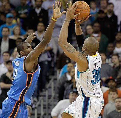 משחק אחרי סל הניצחון של דוראנט, הפעם הרגישו הת'אנדר איך זה לספוג סל שכזה ממש לפני הבאזר. כוכב הערב היה דייויד ווסט (20 נק') שעם זריקת פייד-אוואי אדירה קבע ניצחון תשיעי רצוף להורנטס שפשוט נמצאים על הגל.