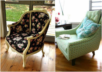 משמאל: כורסה צרפתית מרופדת בבד של KOKKA מיפן עם פרחים ותכשיטים בתוספת נצנצים. מימין: כורסה משנות ה-60 מרופדת בשני בדים של המעצבת AMY BUTLER מבית היוצר של ROWAN.