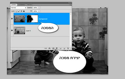 מסכות מאפשרות לנו למחוק חלק משכבה אחת על מנת לראות את השכבה שמסתתרת מתחת לאותה שכבה זאת שיטה קלה ויעילה למשימה שלפנינו. פשוט בוחרים את השכבה העליונה, לוחצים על הכפתור שיוצר מסכה ומתחילים לצבוע במברשת שחורה את כל האזורים שאתם רוצים למחוק מהשכבה הזו.