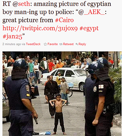 קו ישר מחבר בין הפגנות הענק באיראן בעקבות הבחירות באמצע 2009 לבין המחאה ההמונית נגד שלטונו של חוסני מובארק שגועשת בימים אלה במצרים. בשניהם מילא טוויטר תפקיד חשוב בתיאום בין המפגינים, הפניית זרקור עולמי אל האנשים בשטח ופתיחת ערוץ עדכונים ישיר ביניהם לבין אזרחי שאר העולם.
