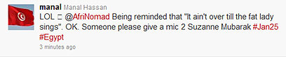 המהומות במצרים מבעירות את הרחוב - וגם את טוויטר. מה מספרים המפגינים? מי ניפח שריריו אל מול טנק מצרי? איך התגברו גולשי מצרים על צנזורת האינטרנט, וגם: מיהי הגברת השמנה שצריכה לשיר כדי שכל זה יגמר? על מחאת טוויטר והומור-מהפיכות