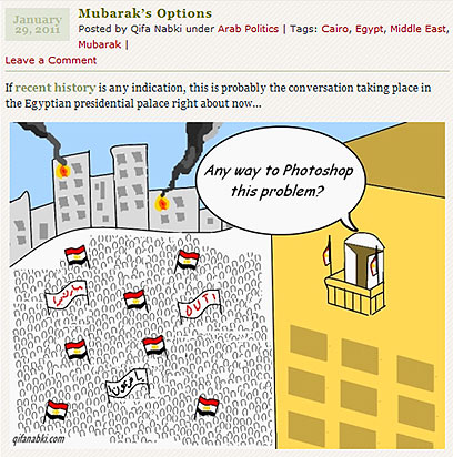 וזו קריקטורה שפורסמה בבלוג שעוקב אחר הפוליטיקה הערבית. מובארק מבקש לפתור את המציאות ברחובות קהיר באמצעי לא שגרתי: פוטושופ.