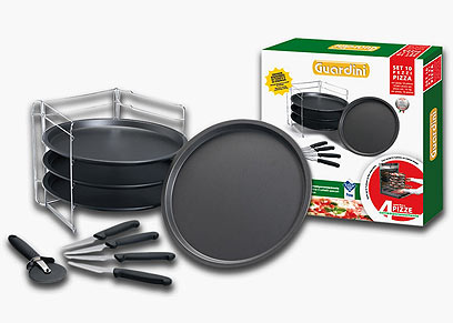 Pizza Mania: ערכה מקצועית להכנת מגשי פיצה משפחתיים בבית, הכוללת מגשי פיצה, מתקן להעמדת הפיצות בתנור, 4 סכיני חיתוך ורולר מקצועי.