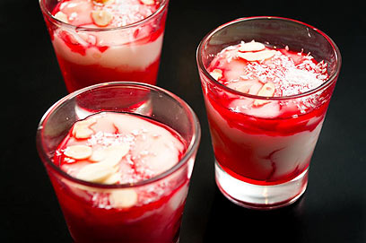 - מוזגים לכוסות הגשה ומקשטים כל כוס בשקדים, קוקוס וסירופ רימונים.