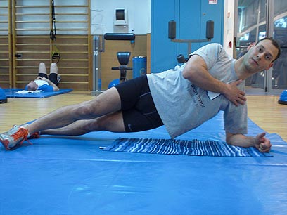 תנוחת המוצא: התרגיל עובד על שרירי הבטן האלכסוניים. שכבו על הצד, הישענו על האמה (המרפק נוגע במזרן) ושלבו את היד השנייה על החזה כך שהיא נוגעת בכתף. הקפידו לא לכופף את הגב העליון.