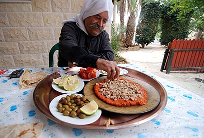 נפרשת על מצע של בורגול מתובל בפלפל אדום יבש. קובה דרוזית