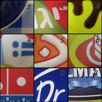 ועכשיו, הנה מה שאתם צריכים להתמודד עימו השבוע: בתמונה יש תשעה ריבועים. בכל ריבוע יש תצלום תקריב של מוצר צריכה בסיסי. מהם תשעת המוצרים בתמונה? את התשובות כתבו לנו בתגובות ולמי שרוצה חיים קלים אפילו הכנתי פתרון דוגמא של המספרים, כדי שיהיה לכם יותר קל: