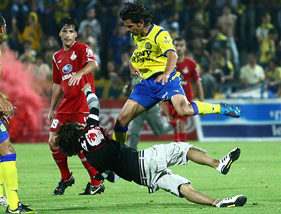 קובי מוסא בועט באוהד אדום. קיבל את "ברכתו" של אבוקסיס (אלי אלגרט)