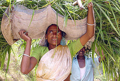 אישה טמילית נושאת קנים על ראשה, באזור נוארה אליה, סרי לנקה