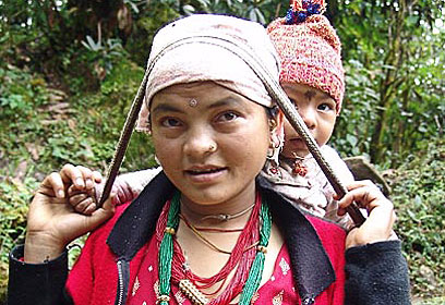 את התינוק הנישא ע"י אימו בתוך סל נשיאה הקשור ברצועה על המצח, פגשתי בדאורלי, נפאל, בטרק הקומבו לאוורסט