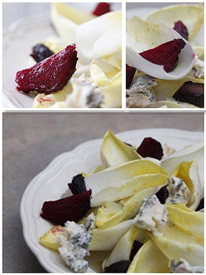 השילוב במראה ובטעם בין עלי האנדיב הלבנים בעלי הפס הצהוב בשוליים לבין הסלקים הורודים-אדומים, עם נגיעות טעם עזות של גבינה כחולה, הוא נפלא בעיניי ויכול לשמש כתוספת לארוחה קיצית או חורפית או כארוחה קלה בפני עצמה.
