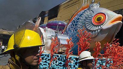 כבאים מצליחים להציל מיצג בצורת דג מאחד המחסנים (צילום: AFP)