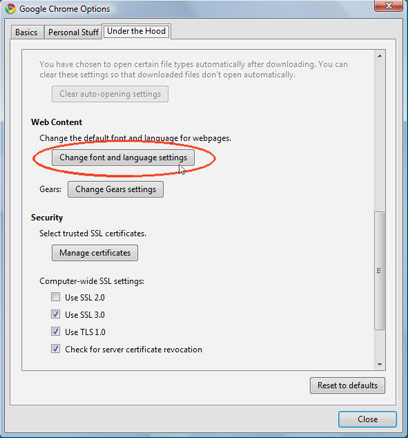 - בחלונית ה-"Options", בחר בלשונית השלישית, "Under the Hood", גלול למטה עד שתגיע לכפתור ששמו "Chage font and language settings", ולחץ עליו.